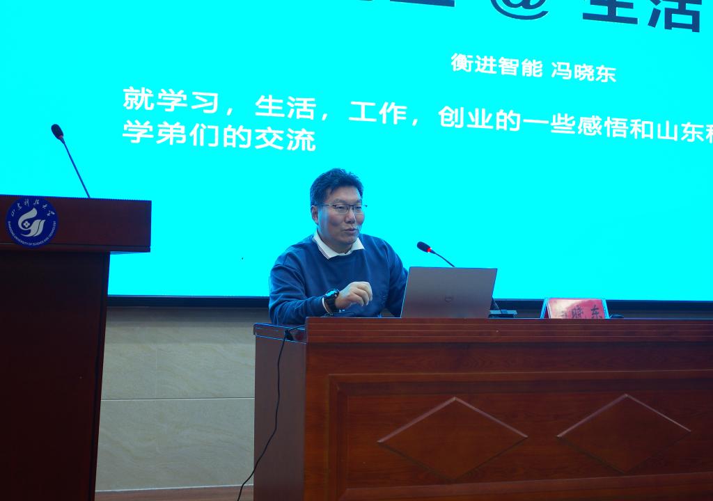 承办的2021年第25期(总第124期)创新创业大讲堂在J11-泰山报告厅顺利举行。青岛市衡进智能科技有限公司总经理冯晓东受邀为学生作了题为“创业即生活”的创新创业专题讲座,讲座由辅导员代佳庆主持。