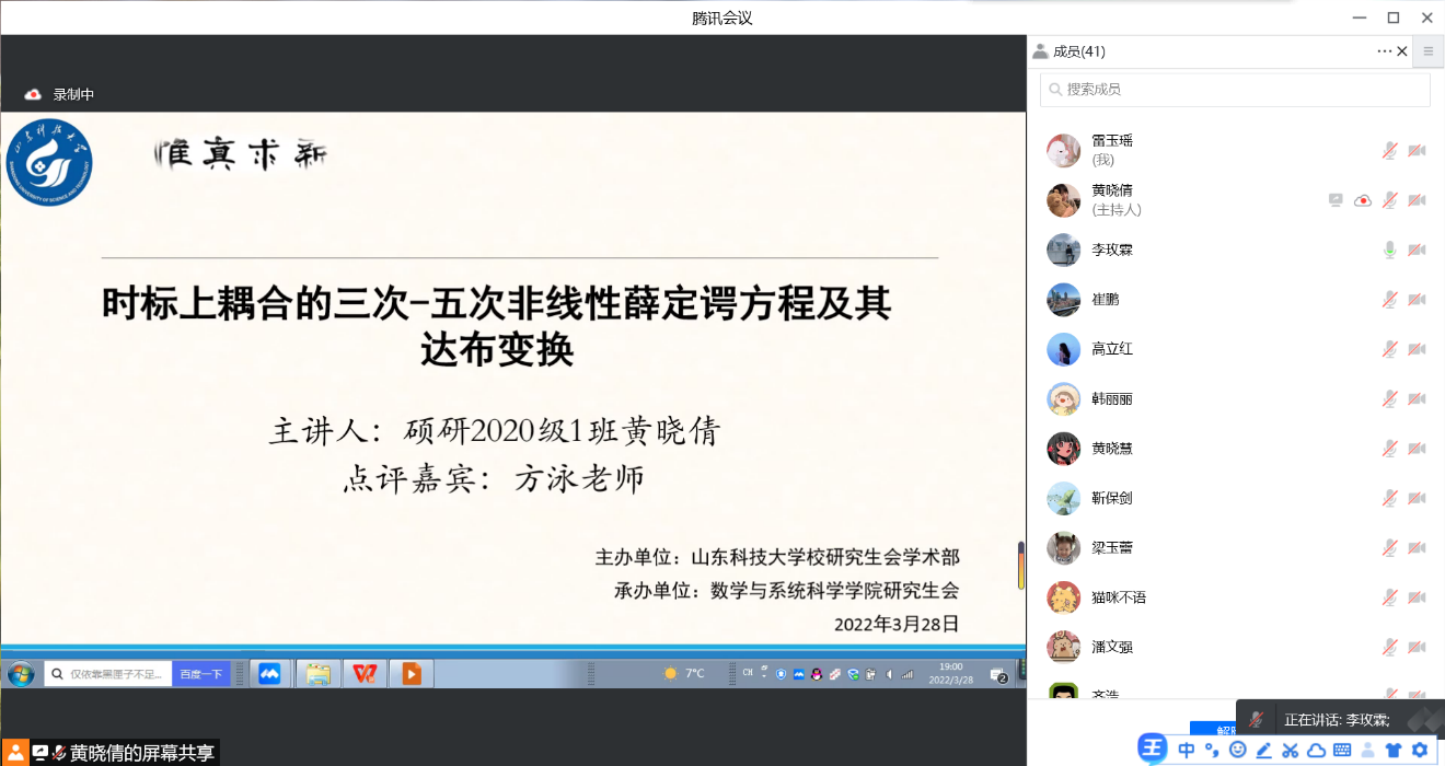 2020级数学专业硕士黄晓倩作了题为“时标上耦合的三次—五次非线性薛定谔方程及其达布变换”的报告。本次点评嘉宾是91快活林