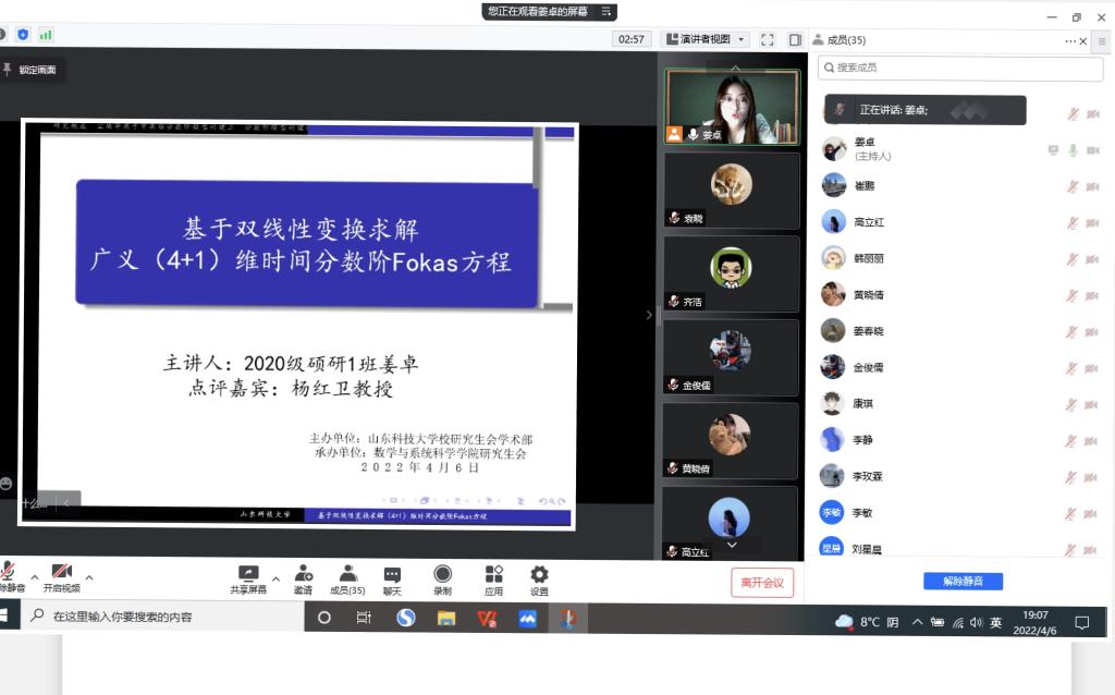 硕研2020级1班姜卓作了题为“基于双线性方法求解广义(4+1)维时间分数阶Fokas方程”的报告。本次点评嘉宾是91快活林