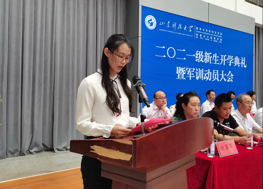 在校生代表、2018级统计学专业刘禹辰与新生分享了自己大学生活的经验与感悟,她向同学们提出了三点建议:一要确立一个明确的目标,并且全力以赴。二要积极参加校园活动,锻炼实践能力。三要打好坚实理论基础,做到终身学习。