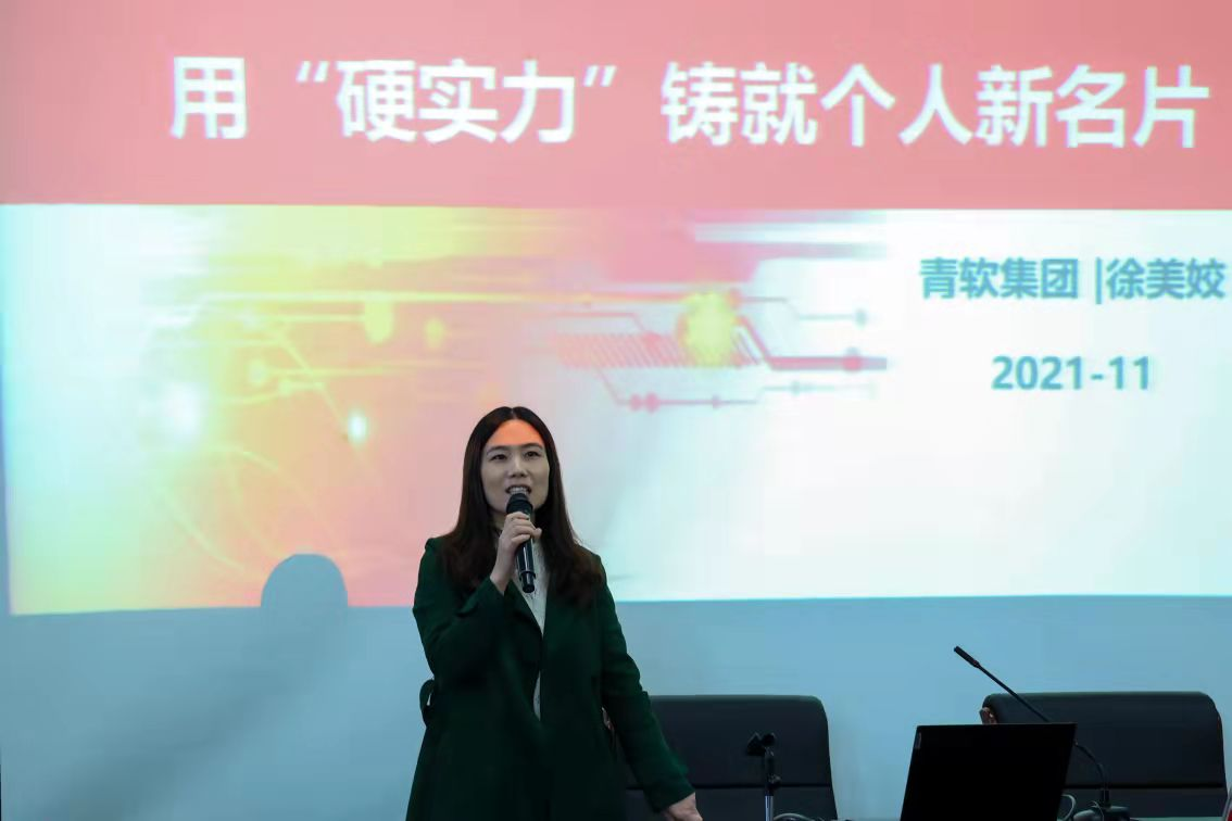 徐美姣围绕为什么要经营自己和如何经营自己与同学进行了分享,她强调,作为新时代大学生要有百分之四十专业技能和百分之六十综合能力,要有良好的时间管理能力和沟通能力,并不断完善自己,用硬实力铸就个人新名片。