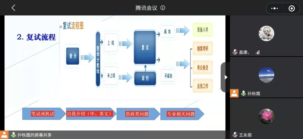 调剂等问题作了详细讲解和答疑,建议同学们密切关注招生单位的复试要求,加强与招生单位的联系,充分做好线上模拟面试、设备调试等前期准备工作。