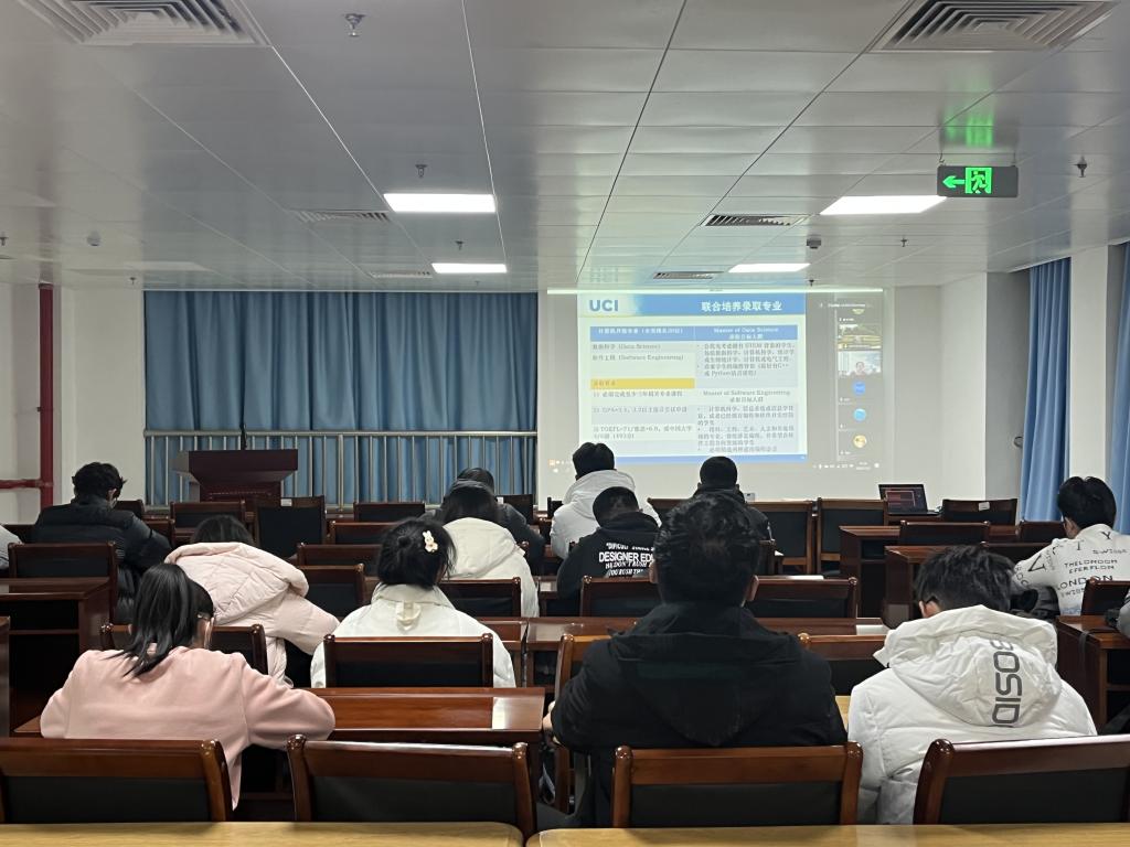 12月2日晚,91快活林 组织有出国留学意向的学生在工程实训大楼1603会议室集中观看了加州大学欧文分校的留学项目线上直播推介会。
