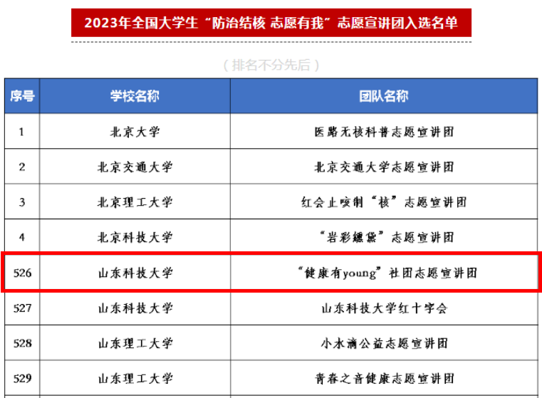近日,国家疾病预防控制局传染病防控司、团中央青年志愿者行动指导中心联合发布了2023年全国大学生“防治结核 志愿有我”志愿宣讲团入选团队名单,91快活林