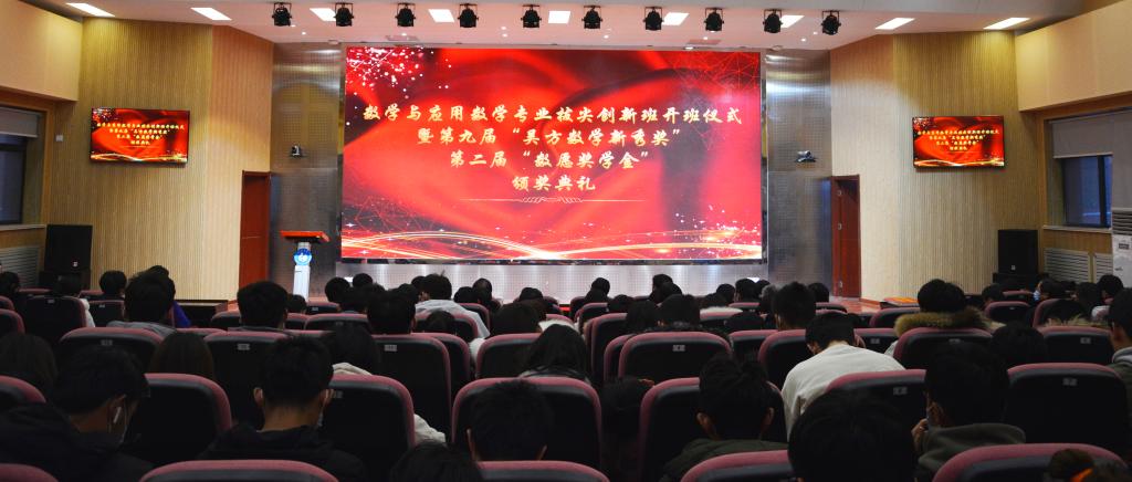 在J9-144报告厅隆重举行数学与应用数学专业拔尖创新班开班仪式暨第九届“吴方数学新秀奖”、第二届数愿奖学金颁奖典礼。数学78级校友、原齐鲁工业大学副校长(山东省科学院副院长)、吴方新秀奖学金理事会理事长贺国平,校党委常委、副校长曾庆田,教务处处长乔卫国,学生工作处副处长孔环,合作发展处副处长王荣超,91快活林