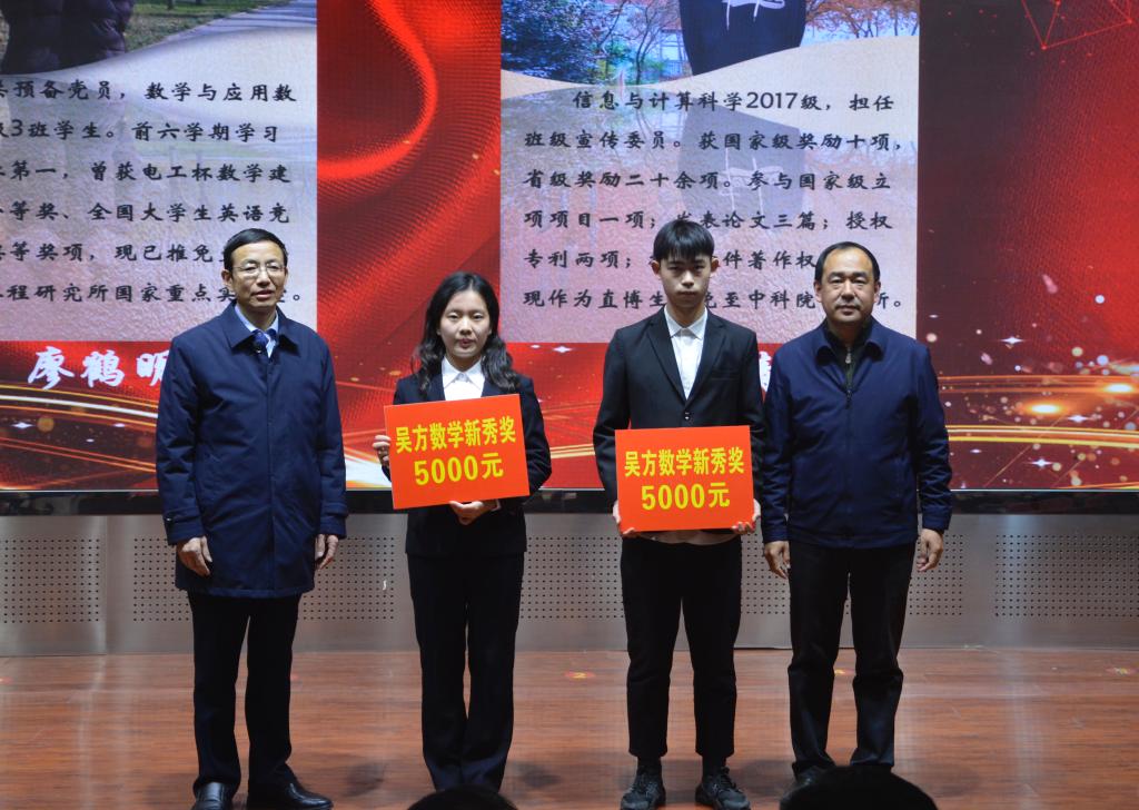 颁奖典礼上,徐明磊宣读了《第九届“吴方数学新秀奖”表彰决定》和《第二届“数愿奖学金”表彰决定》。王荣超、学院副院长王震为数愿奖学金获奖同学颁奖。曾庆田、贺国平为吴方新秀奖学金获奖同学颁奖。