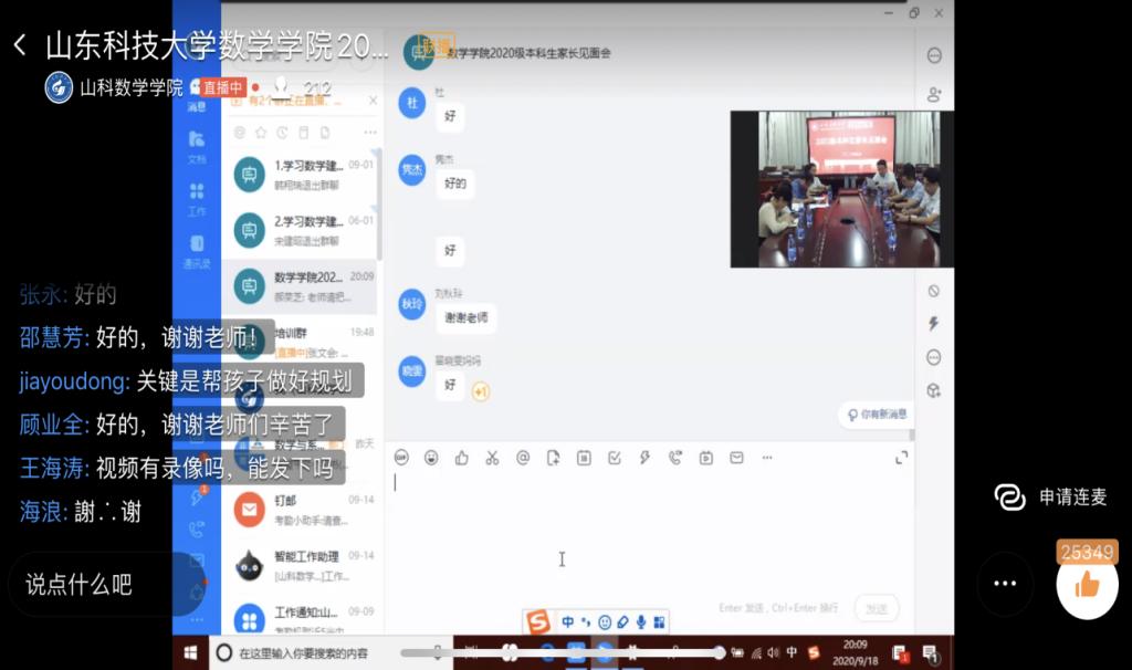 在J9-425会议室举办2020级新生家长“云”见面会。学院党委副书记刘辉,副院长张同迁、杨红卫、方泳,团委书记谢菲菲,2020级新生辅导员及200余名新生家长参加会议。会议由刘辉主持。