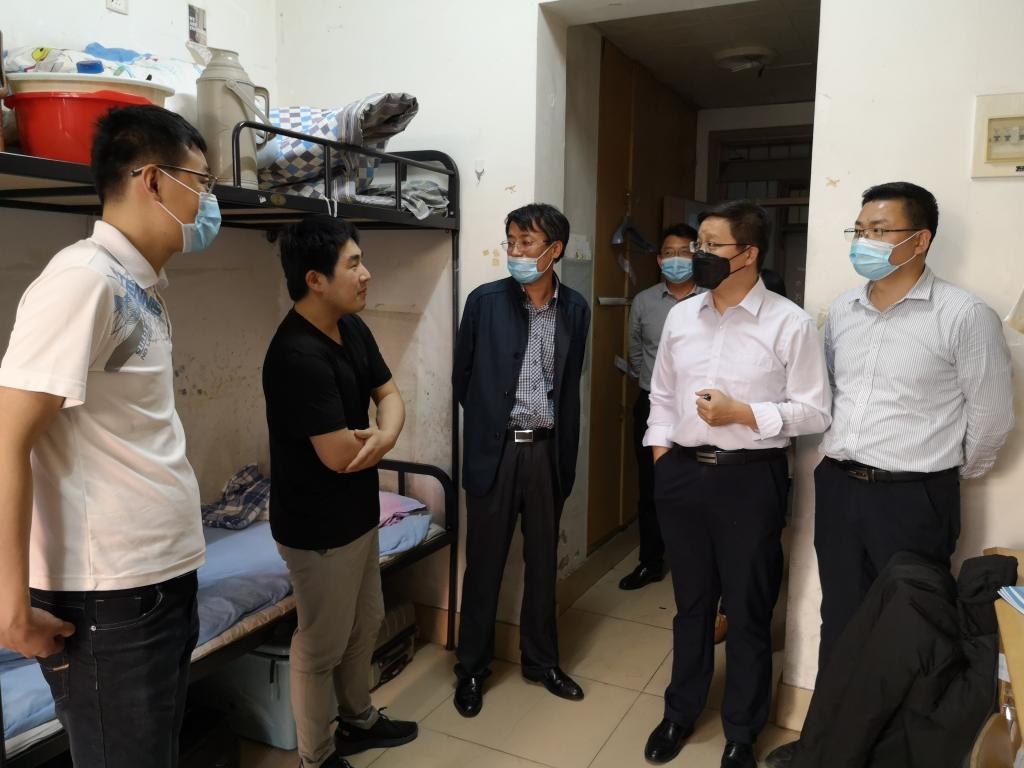 傍晚,学院党委书记徐明磊、院长董焕河、党委副书记兼副院长刘辉、副院长王震、研究生导师邹玉梅及辅导员来到宿舍看望返校学生,各位领导和老师对返校学子表示欢迎,并详细询问了学生的返校后安排、毕业设计进度及就业等情况,叮嘱学生要珍惜时光,刻苦学习,增强防疫意识,做到防疫与学习“两不误”,辅导员也在宿舍现场给学生发放了宿舍消毒记录本和防疫学习手册。