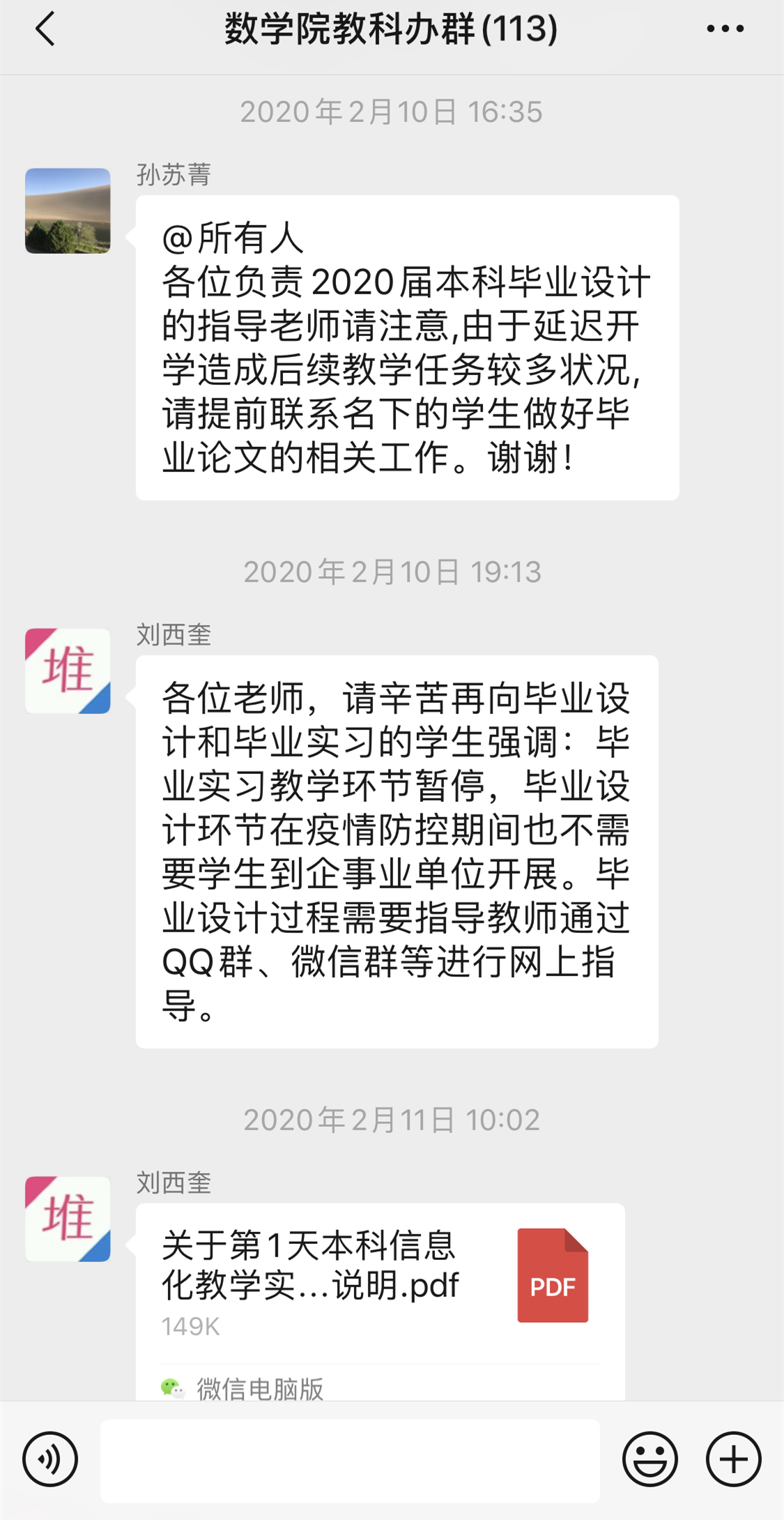 在授课和指导过程中,学院任课教师积极参加信息化教学培训,努力尝试网络教学模式,认真备课、上课、答疑,期间也涌现出了部分优秀典型,高等数学、线性代数作为全校性的公共基础课,覆盖170多个班级,大学数学教学团队精心打造了“基于问题驱动的混合式教学模式”; 数学教学研究部的孙玉梅老师延迟了手术时间,系统科学系的段华老师暂停了出国访学计划,她们都主动承担起了原本没有安排的教学任务;教务科老师也早已进入了忙碌状态,利用电话和教师群、教科办群、学习委员群做好教学指导服务,协调平台数据对接,及时为师生答疑解惑;团委辅导员更是24小时在线,讲好“疫”时思政课,指导开展线上活动,鼓励动员学生自主学习,安抚学生焦虑情绪,及时梳理发布就业调剂信息等。