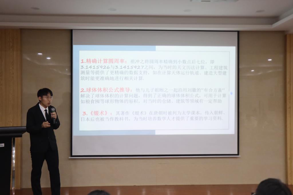在J9-433教室举办数学文化节系列之“了不起的数学家”演讲比赛。本次比赛以“悟数学之思,厚植家国情怀”为主题,旨在通过分享数学家故事、数学史等方面的内容,让更多的人了解数学的价值和魅力。